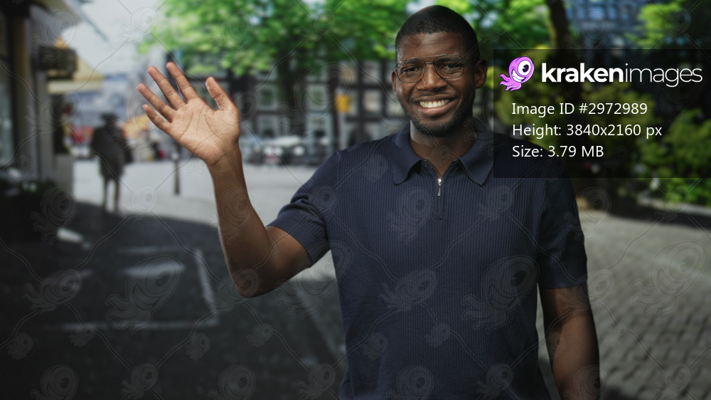 Man with glasses smiling and waving hand on a sunny urban street with cobblestones and trees; friendly greeting.
