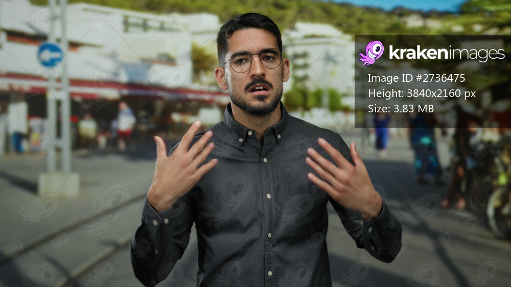 Man with glasses stands confidently outdoors in urban street setting with blurred background of city life.