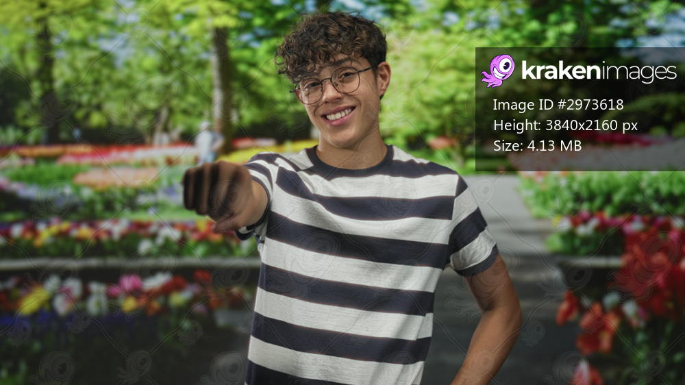 Man with glasses and striped shirt points fist toward camera while smiling, one hand on hip on street lined with trees and flowerbeds; playful youth.