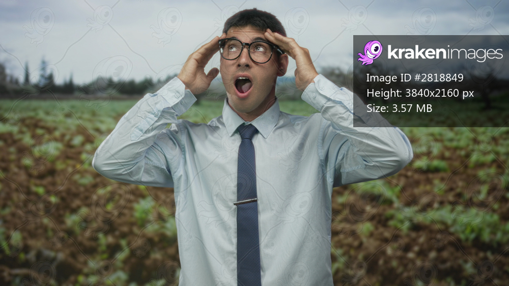 Man with glasses and tie touches temples and holds glasses with hands amid green forest trees; astonishment.