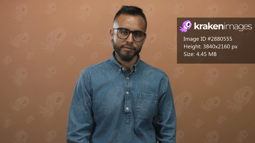 Man with glasses tilting his head in a studio against a warm brown backdrop; thoughtful introspection.