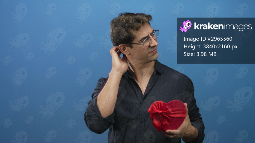 Man with glasses touching cheek while holding red heart gift box in studio against blue backdrop; longing romance.