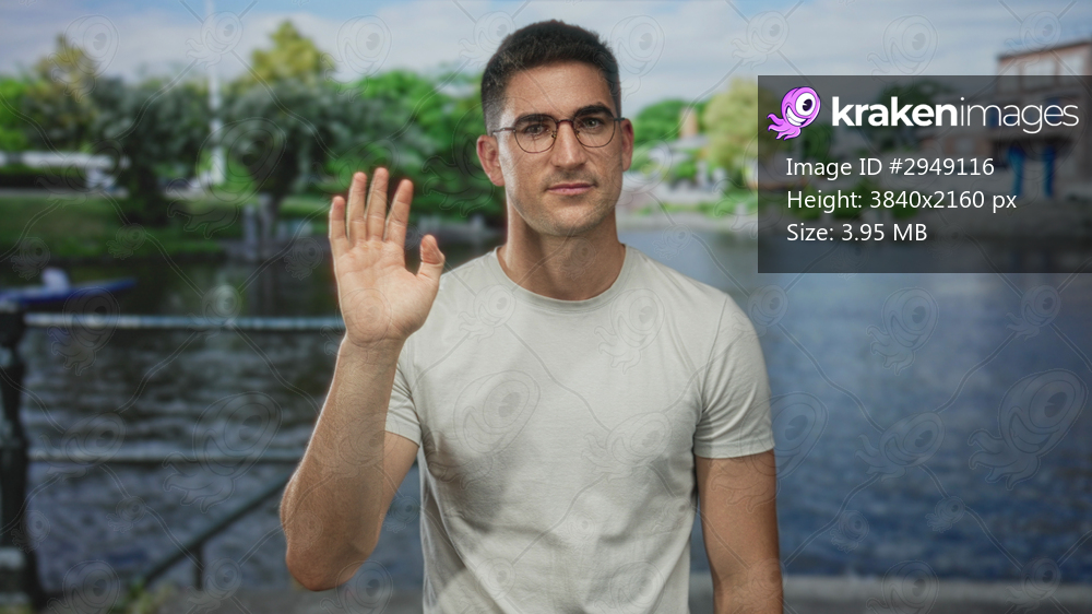 Man with glasses waving right hand by canal railing on amsterdam street wearing white tshirt and slight smile; friendly greeting.