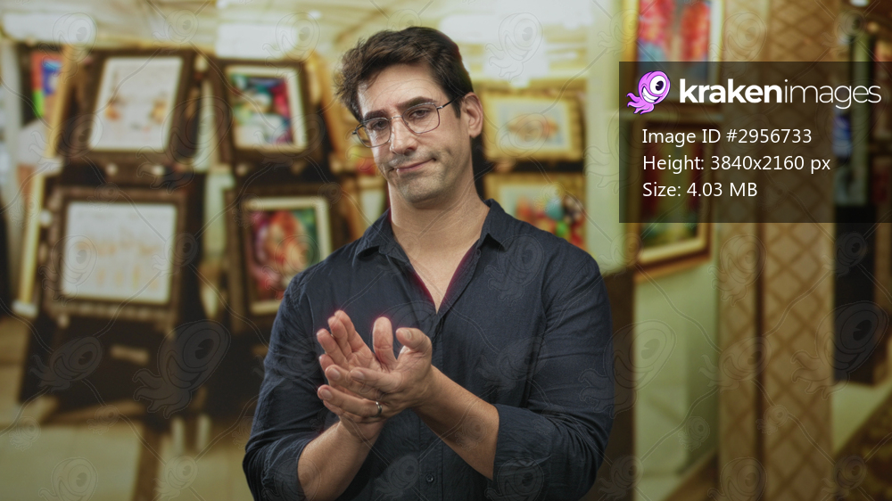 Man with glasses wearing dark shirt rubbing hands near framed artwork on display in a building; mild resignation.