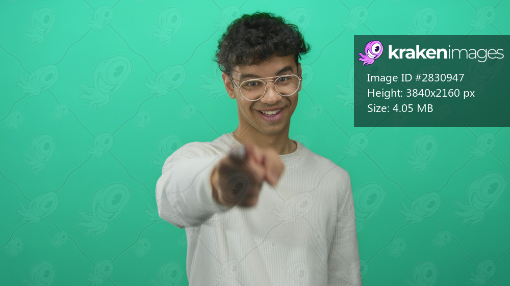 Man with glasses wearing white shirt pointing finger and forming hand heart shape in studio; affection.