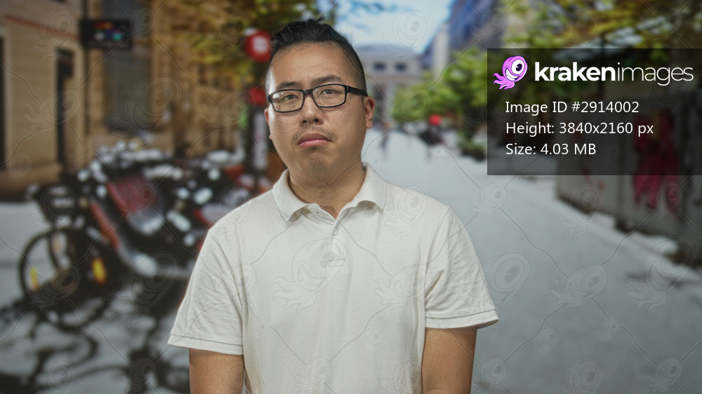 Man with glasses and white polo tilting head, furrowing brow and squinting at camera on street near parked bicycles and graffiti; concern.