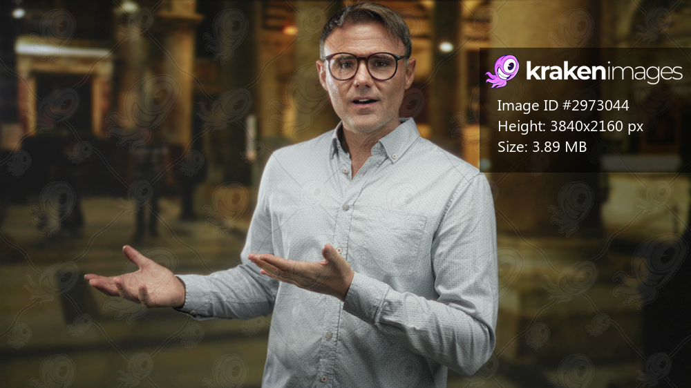 Man with glasses and white shirt gesturing open hands and speaking in a cathedral interior with marble columns and altar; reflection.