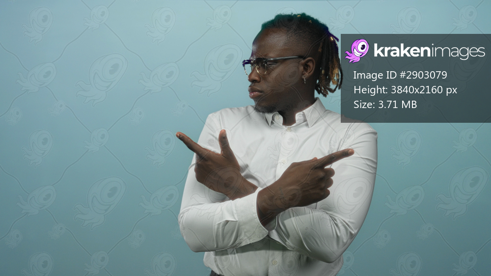Man with glasses and white shirt pointing index finger with crossed arms in studio against teal wall; uncertainty choice.