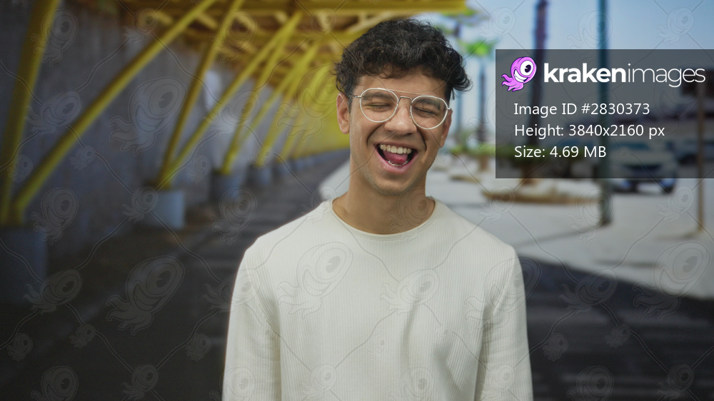 Man with glasses winks with tongue out on bustling sunlit urban street; playfulness youthful energy joy.