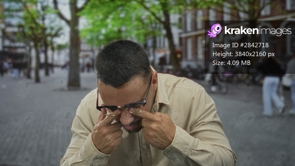Man grabbing face with fingers on street in a mocking crying gesture wearing glasses under green tree canopy; mockery.