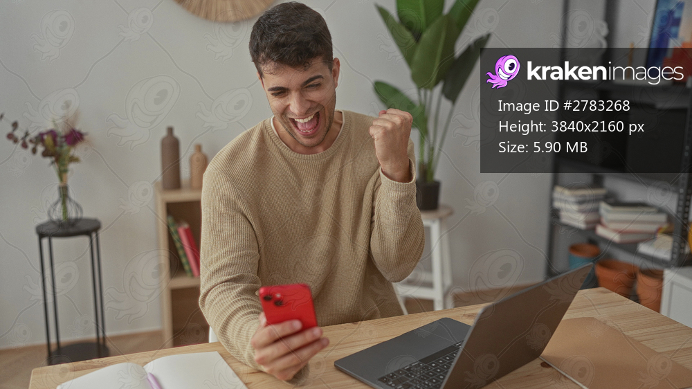 Man grabs smartphone and celebrates at home as a young hispanic male raises mobile in victory during an indoor video call.