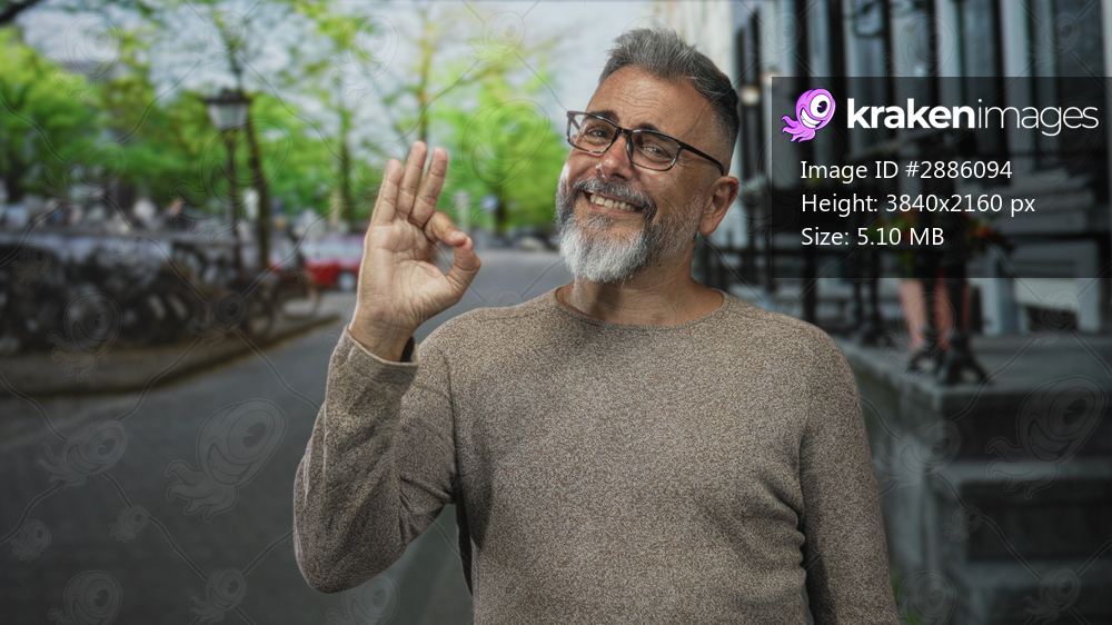 Man with gray beard and glasses making ok sign with right hand on tree lined city street by parked bicycles and stone steps; confidence approval.