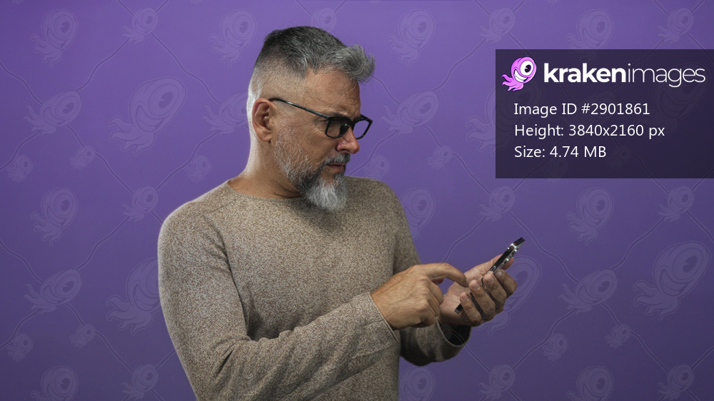 Man with gray beard and glasses pointing finger at smartphone in purple studio, wearing beige sweater; concentration digital communication.