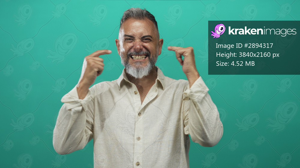 Man with gray beard grinning and pointing fingers toward camera in teal studio wearing a beige linen shirt; joy confidence.