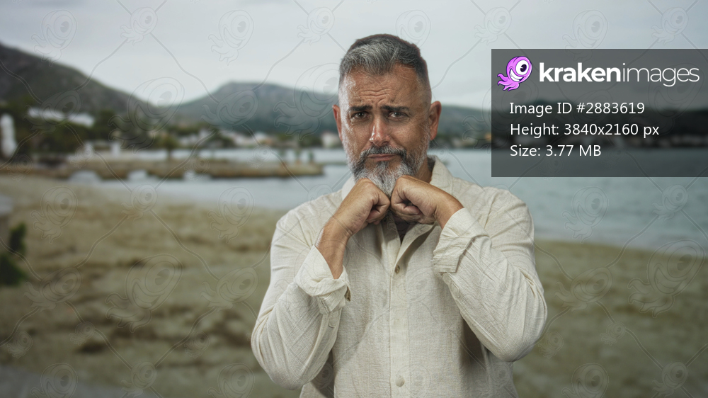 Man with gray beard holding hands near chin and arms crossed on sandy beach by pier and waterfront village; contemplation.