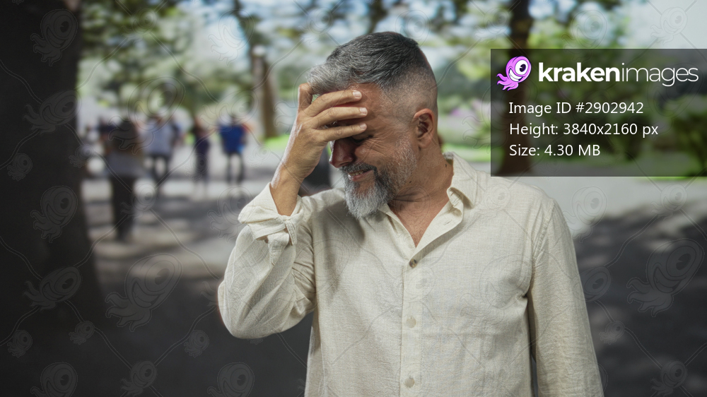 Man with gray beard in cream linen shirt holding hand to forehead and smiling on a forest path with blurred pedestrians; amusement reflection.