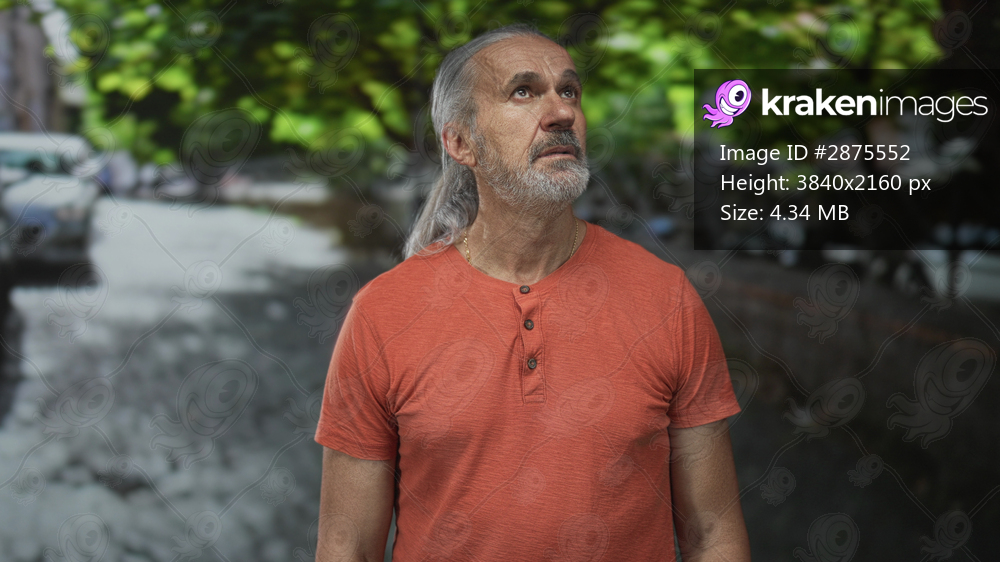 Man with gray beard and long hair looking up on tree lined street in orange shirt and gold chain; serenity reflection.