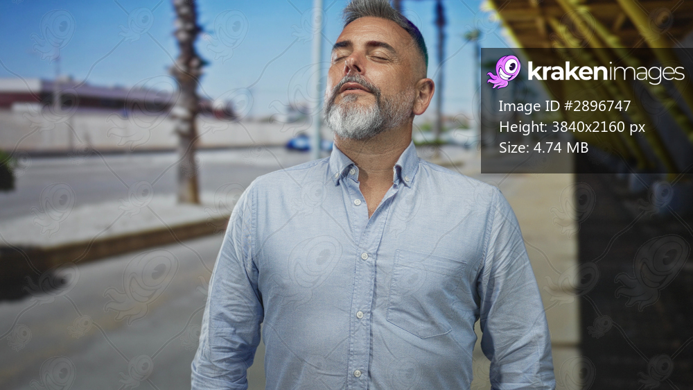 Man with gray beard and open collar standing with eyes closed, breathing slowly on a sunny street lined with palm trees and yellow canopy; calm reflection. - Kraken Images