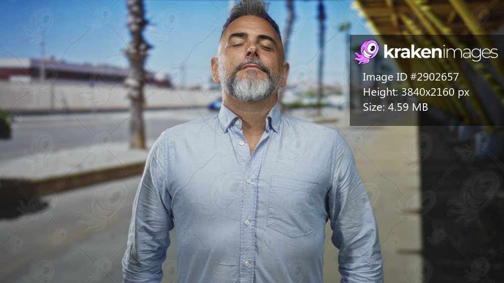 Man with gray beard and open collar standing with eyes closed, breathing slowly on a sunny street lined with palm trees and yellow canopy; calm reflection. - Kraken Images