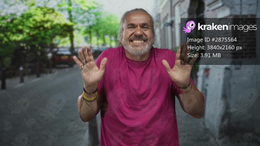 Man with gray beard raising both hands palms out on a city street wearing a bright pink t-shirt and bracelets, smiling with eyes closed; joy.