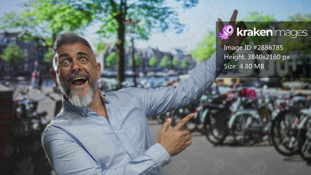 Man with gray beard wearing blue shirt pointing with both hands, open mouth and wide smile, on an amsterdam street by parked bicycles and canal houses; joy spontaneity. - Kraken Images