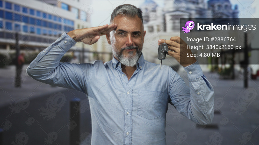 Man with gray beard wearing light blue shirt holding car keys and saluting with hand to forehead on a city street outdoors near modern buildings; confidence. - Kraken Images