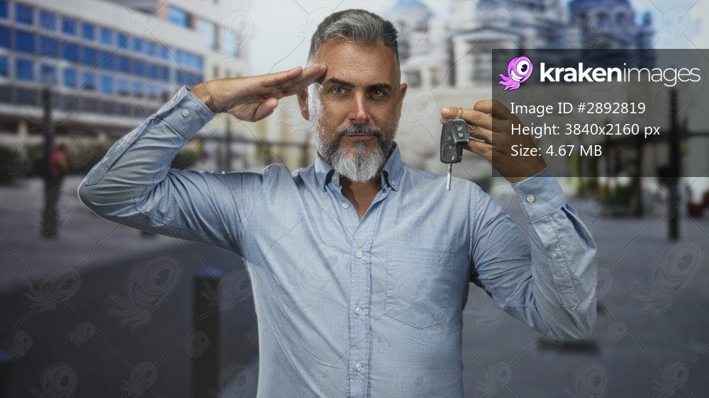 Man with gray beard wearing light blue shirt holding car keys and saluting with hand to forehead on a city street outdoors near modern buildings; confidence. - Kraken Images