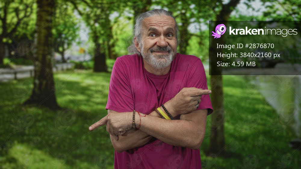 Man with gray hair and beard points finger to the right in a forest park by a pond, wearing pink t shirt and bracelets; playful curiosity.