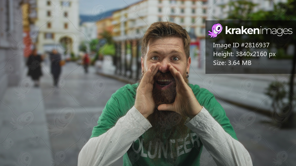 Man with green volunteer shirt and beard cups hands around mouth for shouting on street; community support enthusiasm.