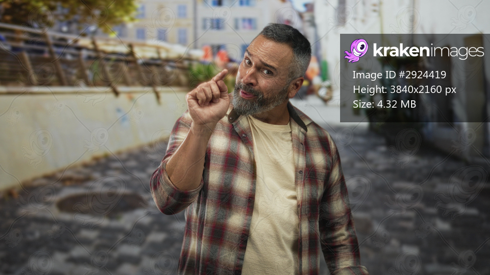 Man with grey beard points finger down a cobblestone street beside a building, forearm exposed; anger confrontation.