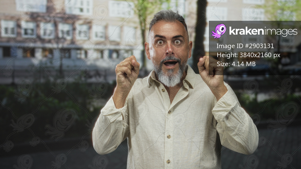 Man with grey beard rubbing eyes and raising hands in a startled gesture on an amsterdam street by a canal and buildings; surprise tiredness.