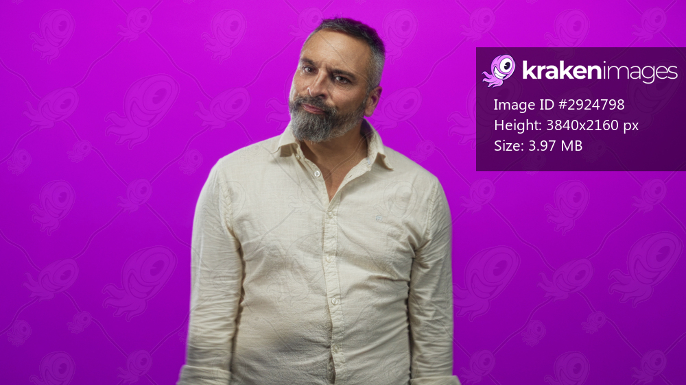 Man with grey beard shrugs and points with open palms in purple studio wearing a beige shirt and beaded bracelets; uncertainty.