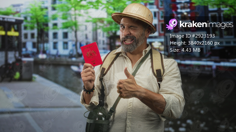 Man with grey hair and backpack holding a red passport and giving thumbs up while winking on a street by an amsterdam canal; travel adventure excitement. - Kraken Images