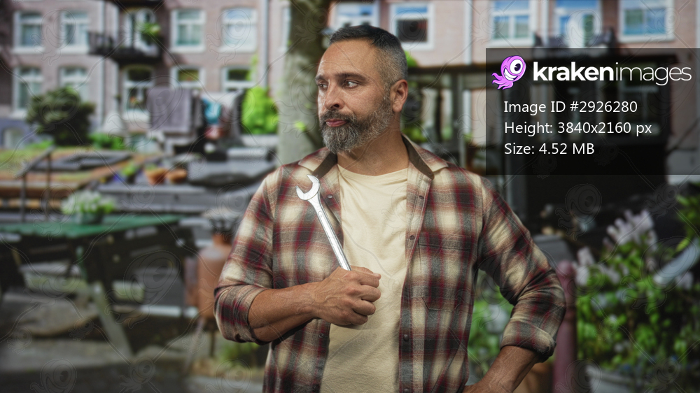 Man with grey hair and beard holds wrench to chest on a street by a brick building, wearing flannel shirt and t shirt; quiet pride.