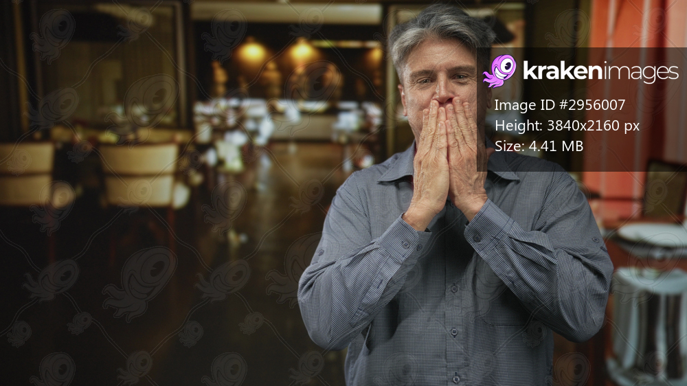 Man with grey hair blowing a kiss, hands covering mouth, smiling in a restaurant building; affectionate warmth.