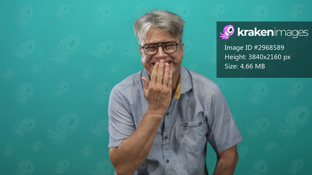 Man with grey hair and glasses covers mouth with hand while smiling in a studio against a teal backdrop; playful gentle amusement.
