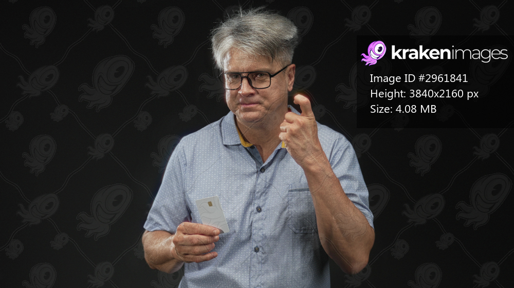 Man with grey hair and glasses holding creditcard and pointing finger while smiling in studio; confidence convenient payment acceptance.