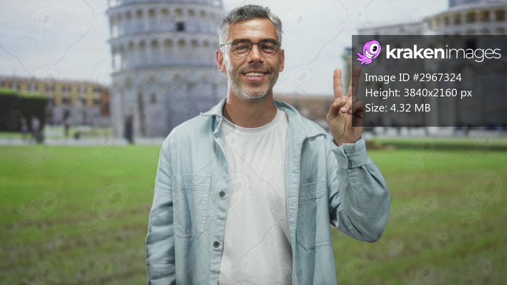 Man with grey hair and glasses shows peace sign with hand in front of the leaning tower building in a tourist square; vacation joy.