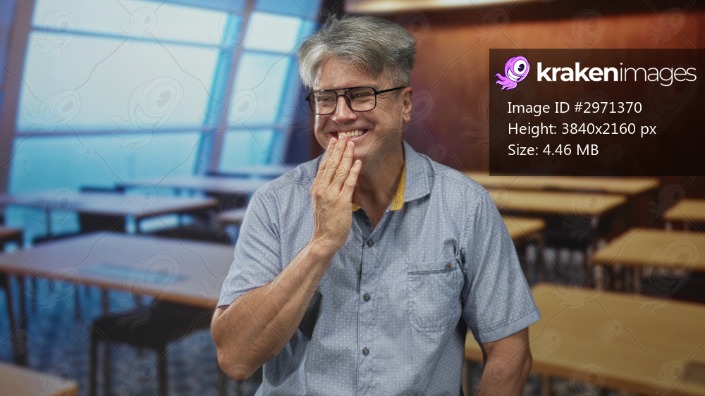 Man with grey hair and glasses smiling, hand to mouth gesture in a classroom building among desks and windows; amusement.