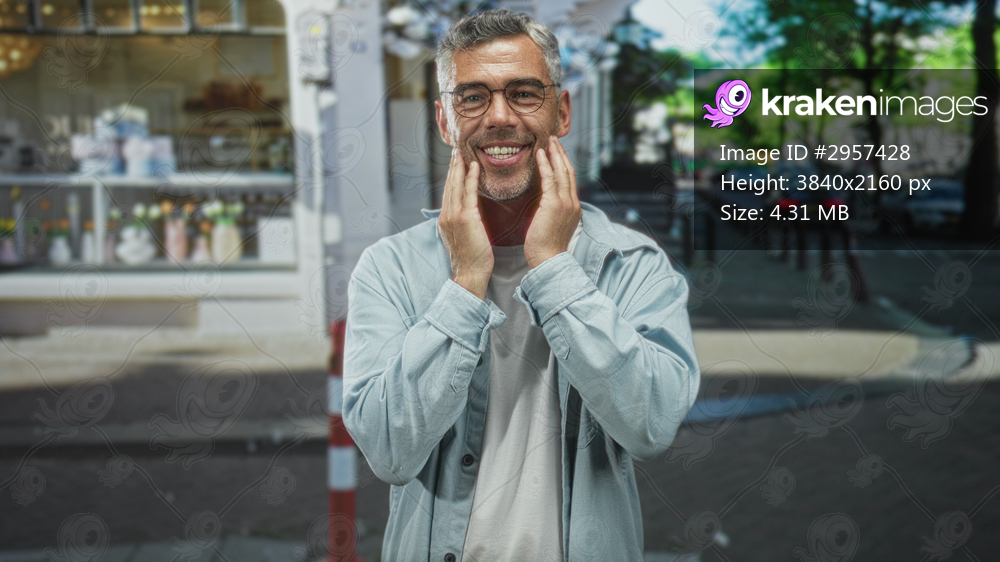 Man with grey hair and glasses touching his cheeks and smiling in front of a shop window on a sunny street with parked cars and trees; contentment.