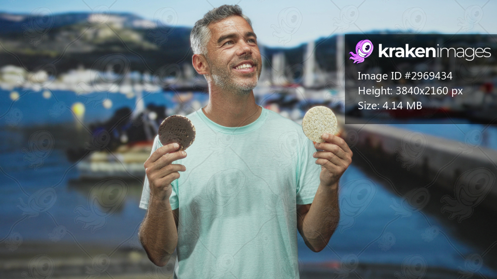 Man with grey hair holding one corn pastry in each hand, smiling and presenting with hands visible on a street by a marina pier; summer leisure contentment. - Kraken Images