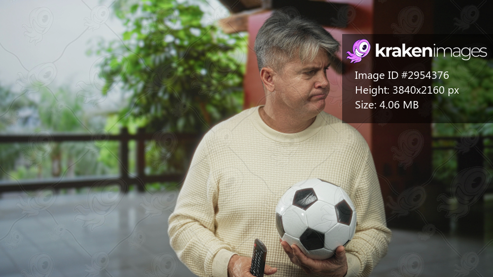 Man with grey hair holding remote and soccer ball, visible hands showing hold gesture in building; disappointment doubt.