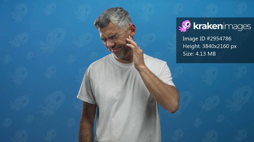 Man with grey hair in a white t-shirt pressing his hand to his ear, grimacing and squinting in a blue studio backdrop, middleaged and visibly uncomfortable; discomfort. - Kraken Images