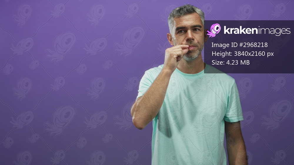 Man with grey hair in mint green tshirt pinching fingers to lips in studio, gesture suggests silence or a small pinch near mouth; quiet contemplation.