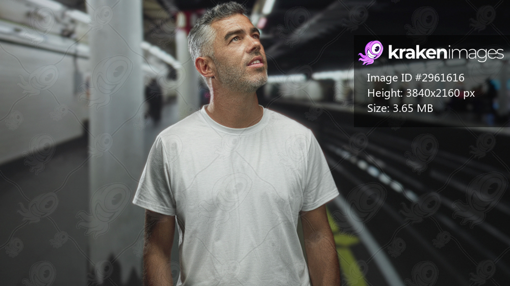 Man with grey hair in white tshirt looking up, standing near tracks on a subway platform inside a building; contemplation solitude.