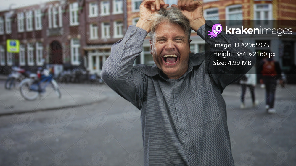 Man with grey hair laughing, raises hands above head then covers face with hand on street; joy spontaneity.