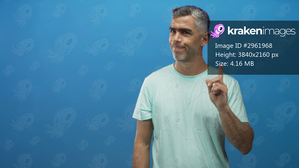 Man with grey hair pointing index finger, hand raised and smiling while wearing mint t shirt in studio; friendly suggestion.