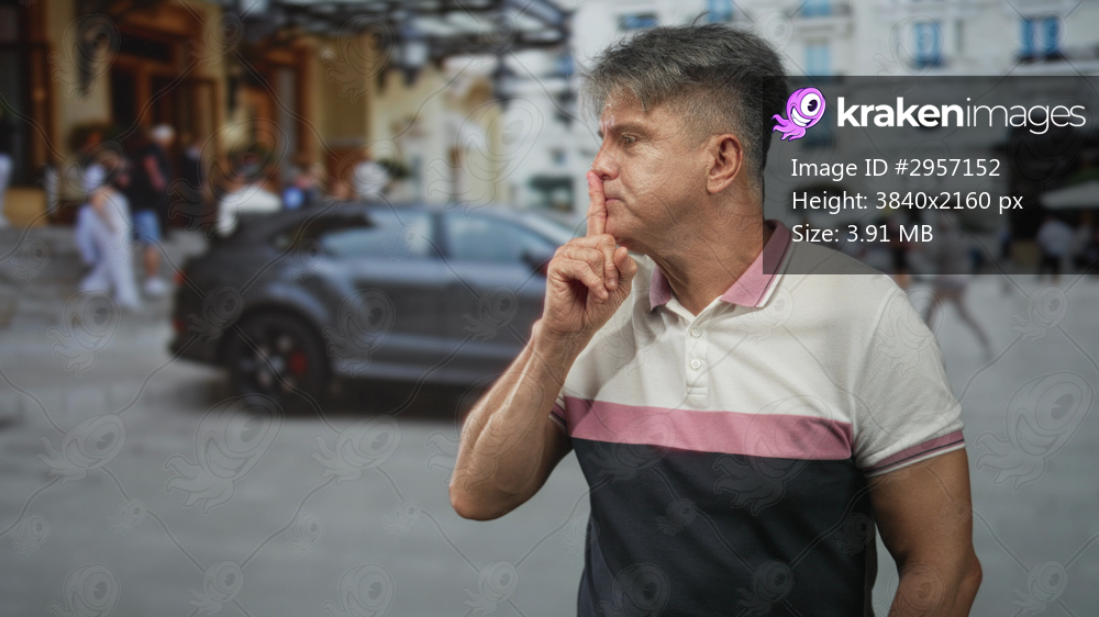 Man with grey hair pressing index finger to lips and nose beside a parked car in a crowded city street; thoughtful hesitation.