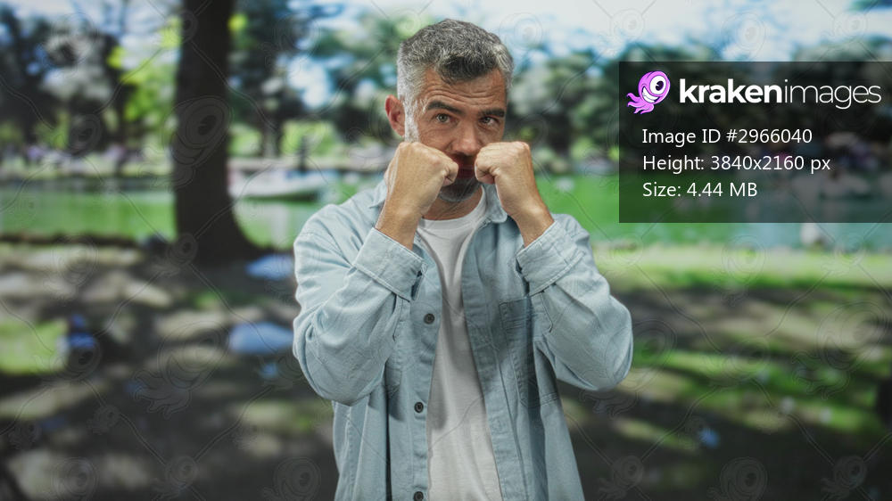 Man with grey hair shadowboxing with raised fists and guarded stance in a forest setting near a pond, wearing light denim shirt; training focus.