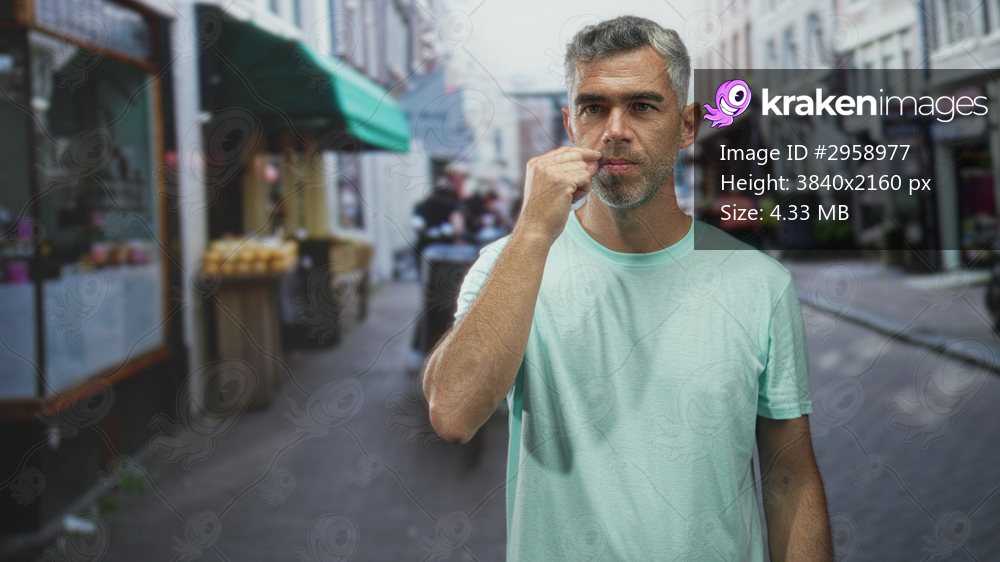 Man with grey hair standing on street in front of shop and green awning, right hand mid-gesture and relaxed posture; thoughtful reflection.